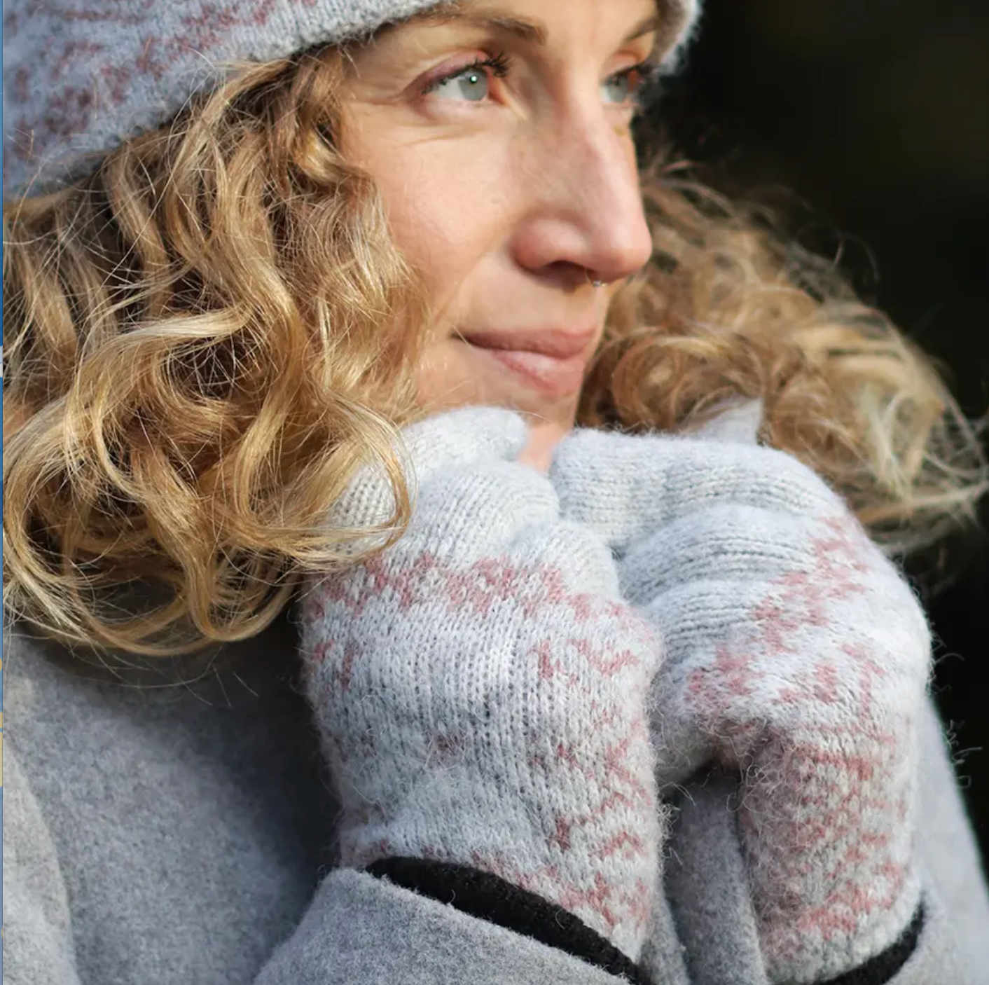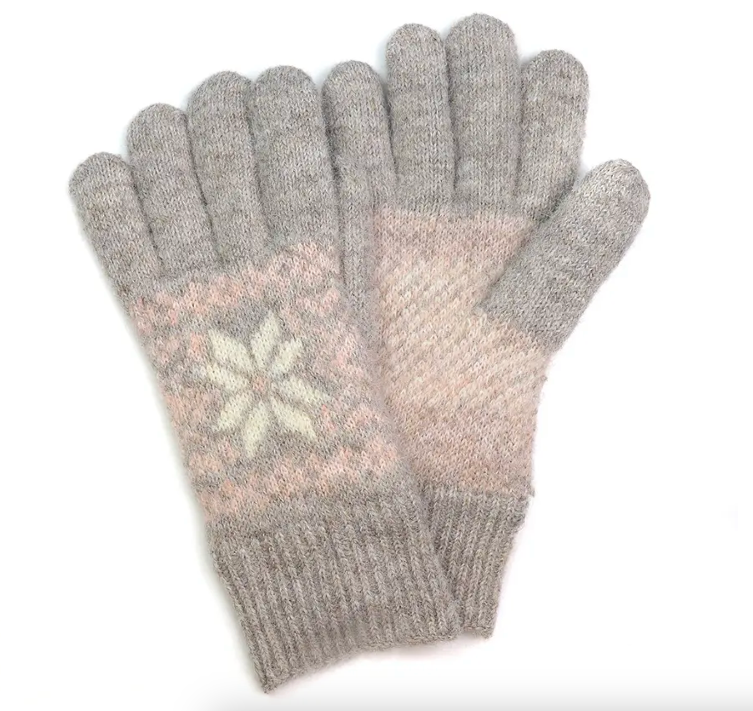 Stay cosy and eco-friendly with our Nordic lined grey starflower gloves. Made from recycled materials, these pale grey knit gloves feature a unique nordic starflower design and a fleece lining for extra warmth.